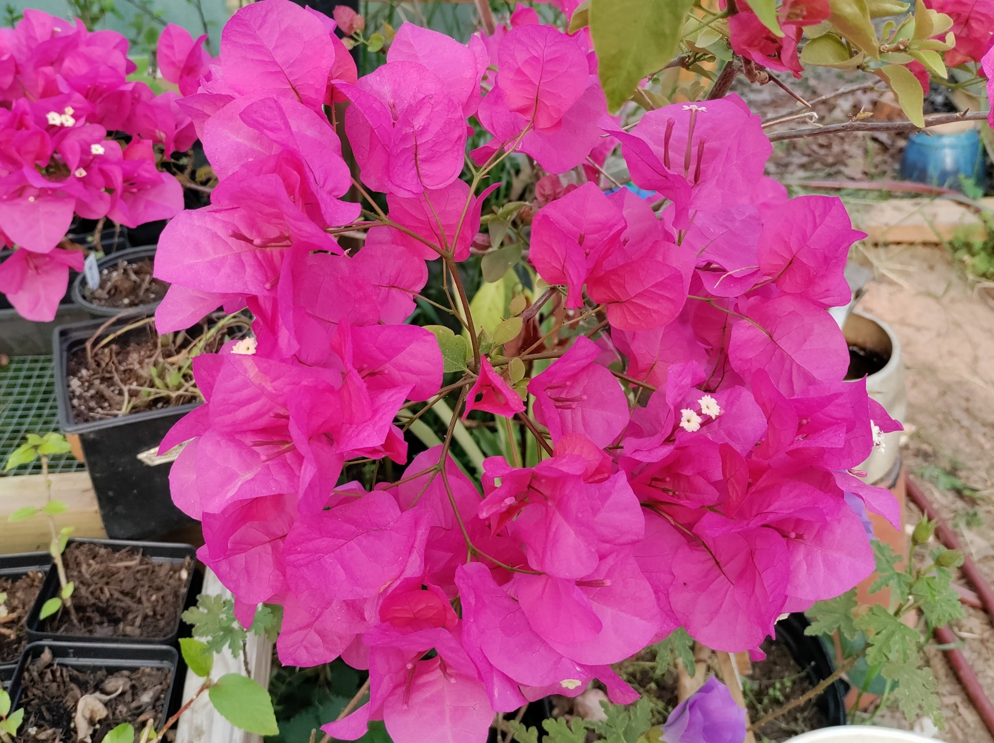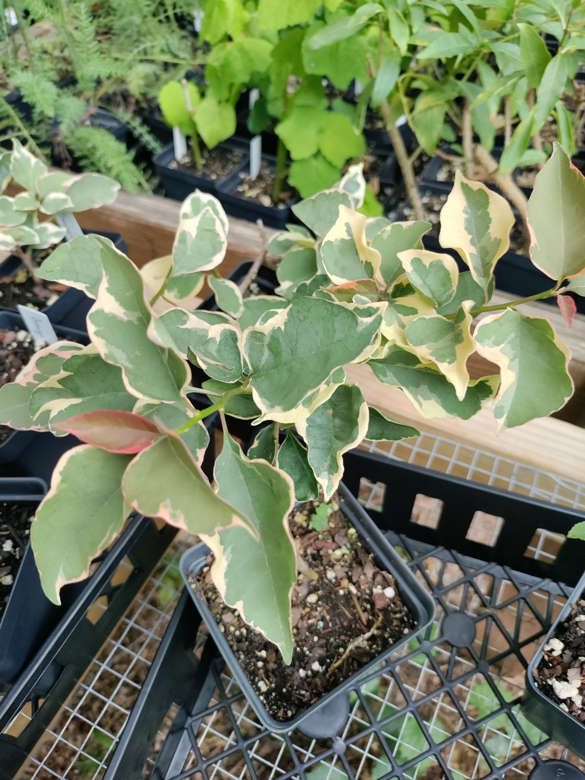 'Raspberry Ice' is a variegated leaf form of bougainvillea. The white and green leaves contrast beautifully with the bright pink flowers. It is well-adapted to survive dry environments once established, and prefers full sun, although it will tolerate partial sun. Blooming period varies with the climate you're in, but it is capable of blooming most any time of year that it's warm enough. Bougainvillea is perennial for only zones 9+, so if you plant this in a pot somewhere colder than zone 9, move it indoors during winter. Be mindful when you move it though, because it does have thorns.