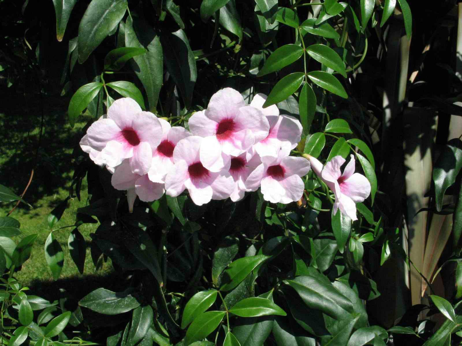 This quick-climbing Australian native is perfect for growing on a trellis or arbor, and will treat you to beautiful white flowers with pink throats. It will also work as a potted plant in colder climates, as long as you don't mind lugging the pot indoors during winter. When planted in the ground, the cold hardiness for the plant is at least zone 8, although I think it works best as zone 9 and warmer plant. It blooms on "old wood", not new shoots, so if you want the most flowers, preserve as much of the vine as possible, and avoid those hard freezes.