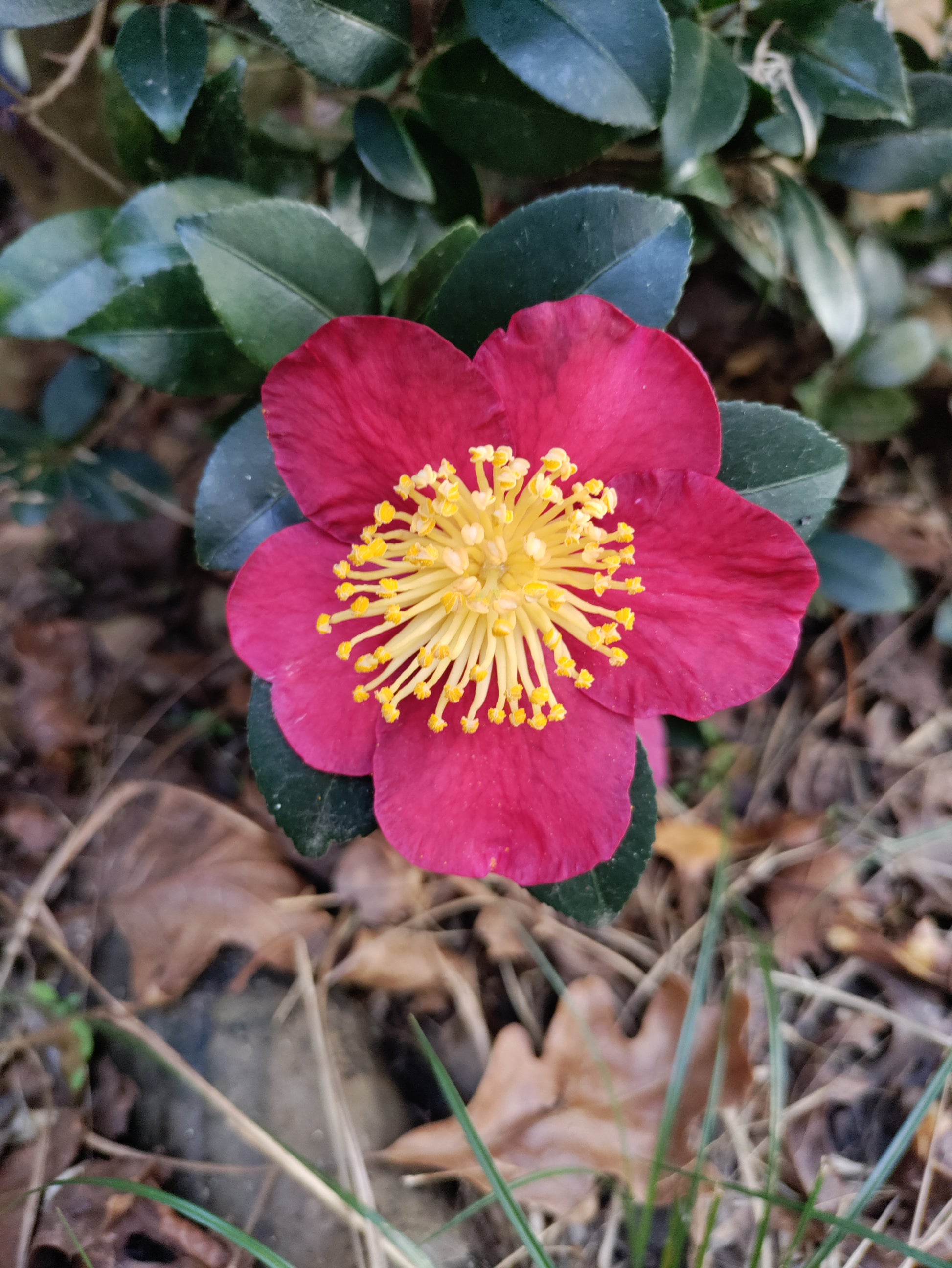 Camellia sasanqua 'Yuletide' displays one of the few true red flowers in camellias from fall through winter. Compact growth of dark green leaves contrast well with the bright red and yellow flowers, and it just can't help but make you think of the Christmas season. The plant can get quite large, but responds well to trimming, which makes it a good hedge as well as stand-alone plant.