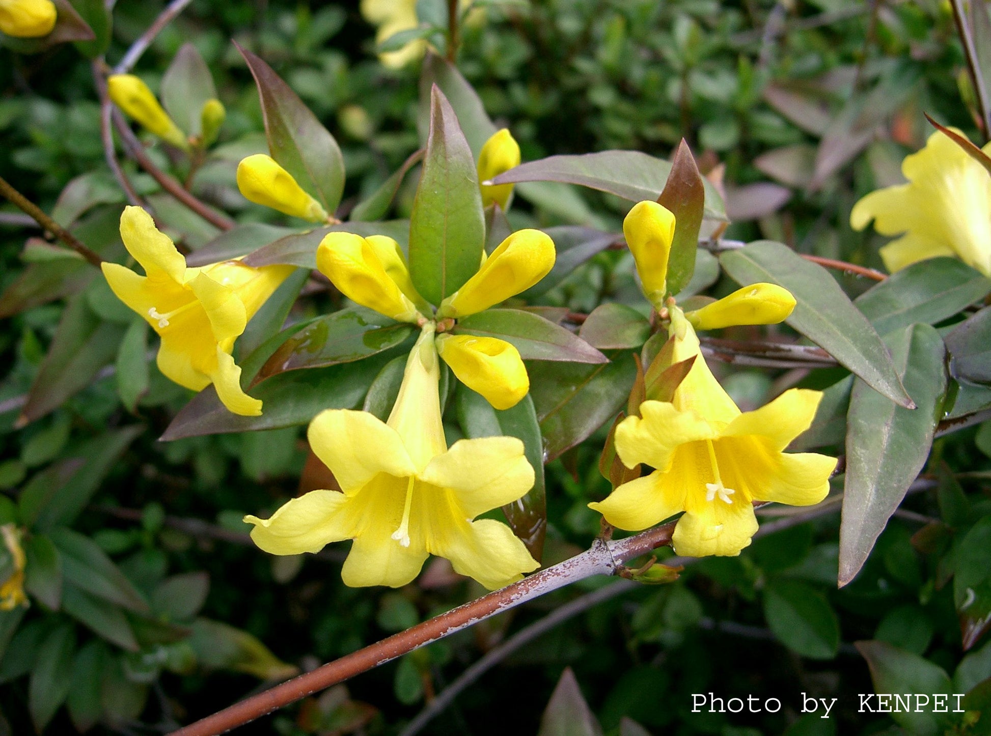 Carolina jessamine (Gelsemium sempervirens) is a semi-evergreen vining perennial that is native to the southeastern U.S. It has 2" long tubular fragrant yellow flowers that bloom en masse during early to mid-spring. It can quickly cover a fence, arbor, or slow-moving animal, so plant it where it can be easy to maintain the growth. Also, all parts of the plants are toxic, so if you have small children or dogs, be aware of this.