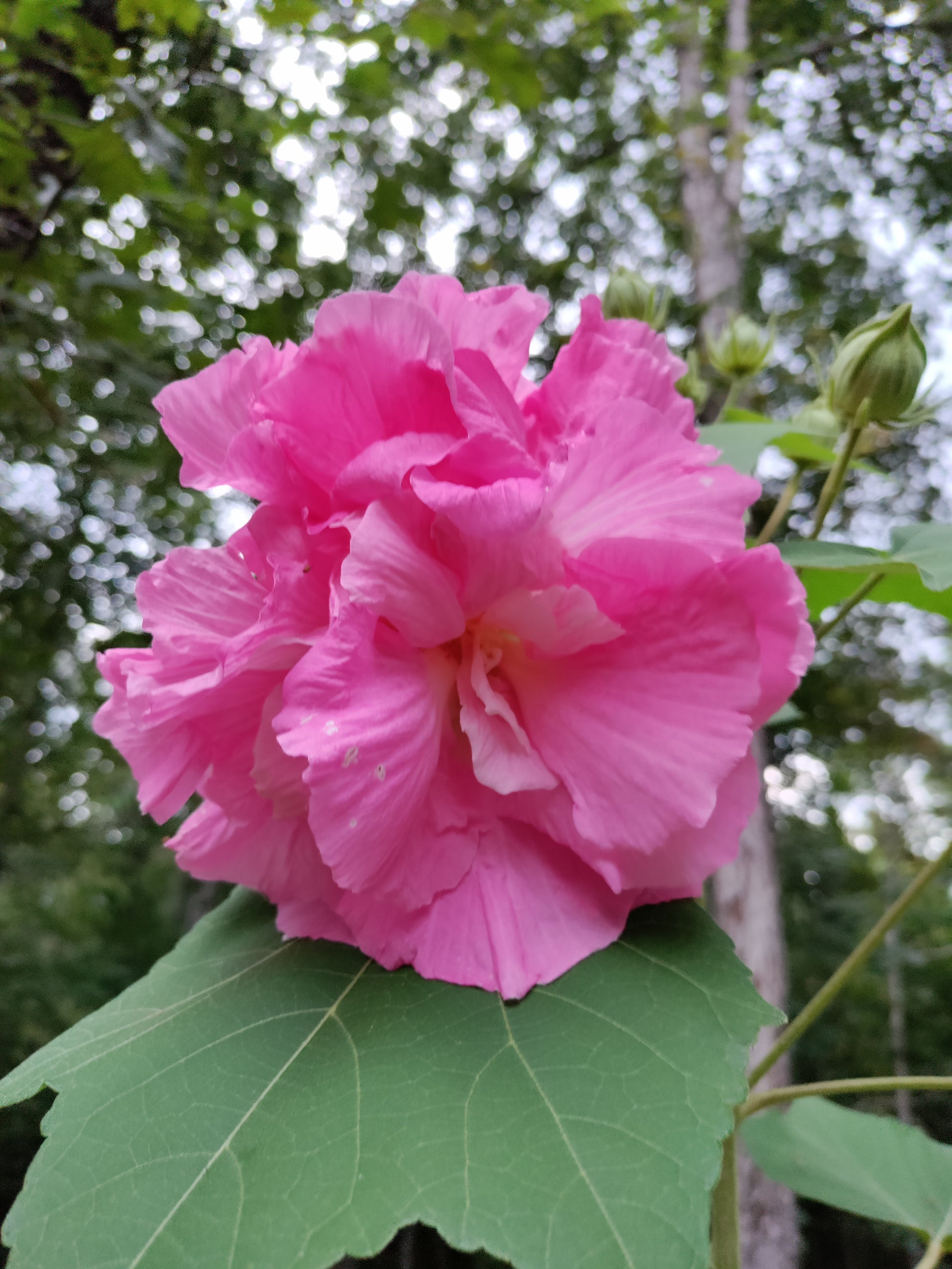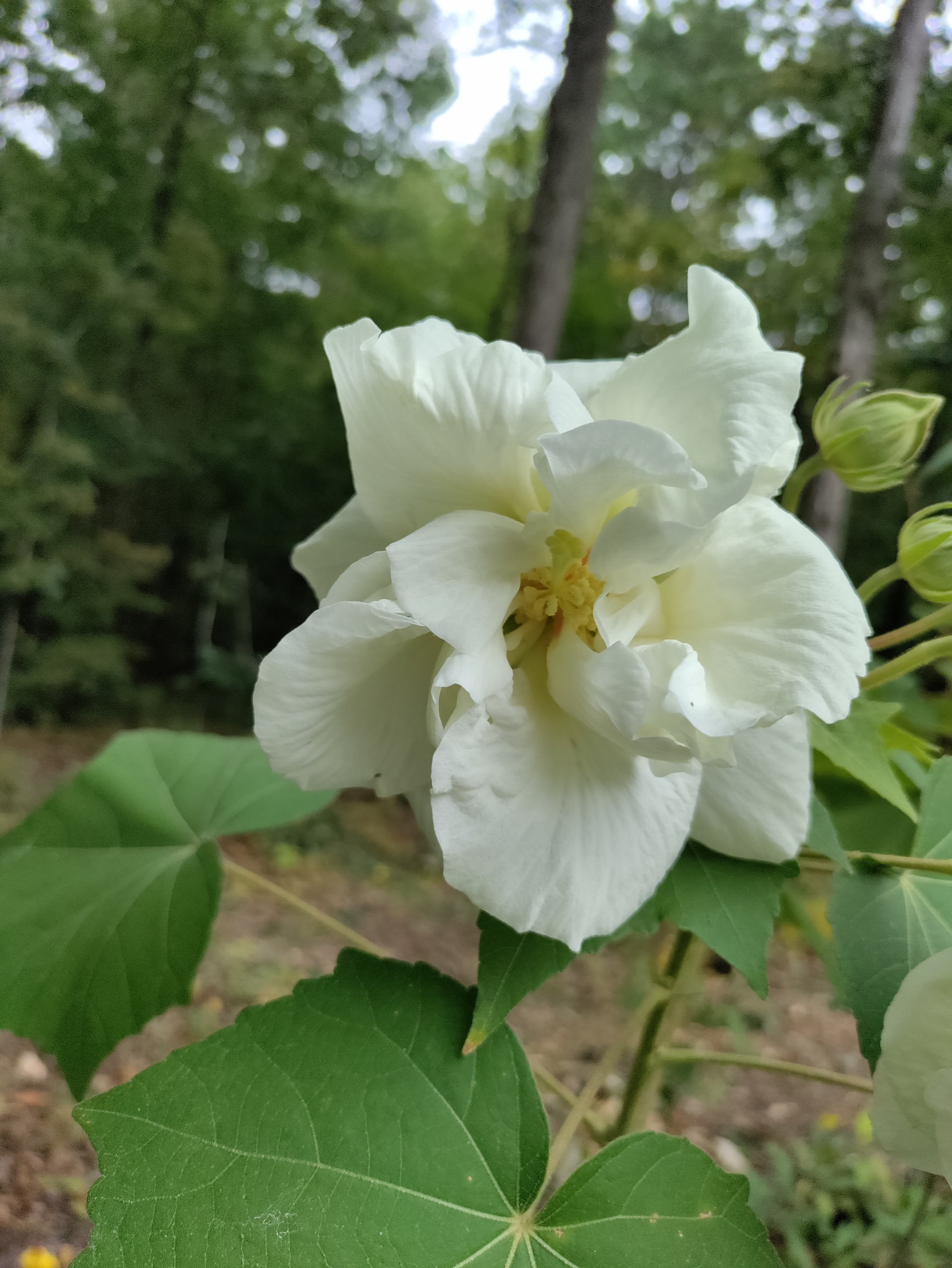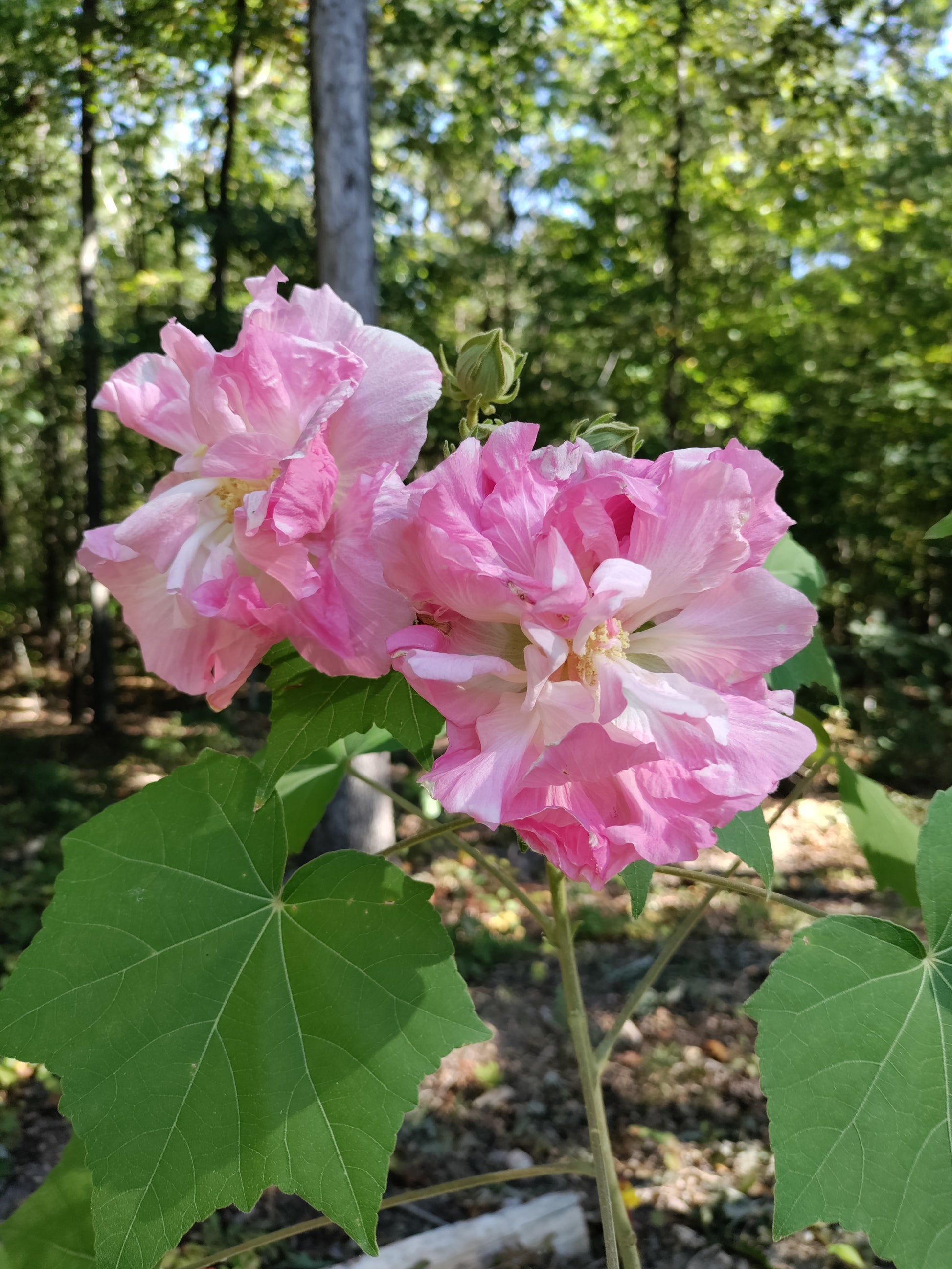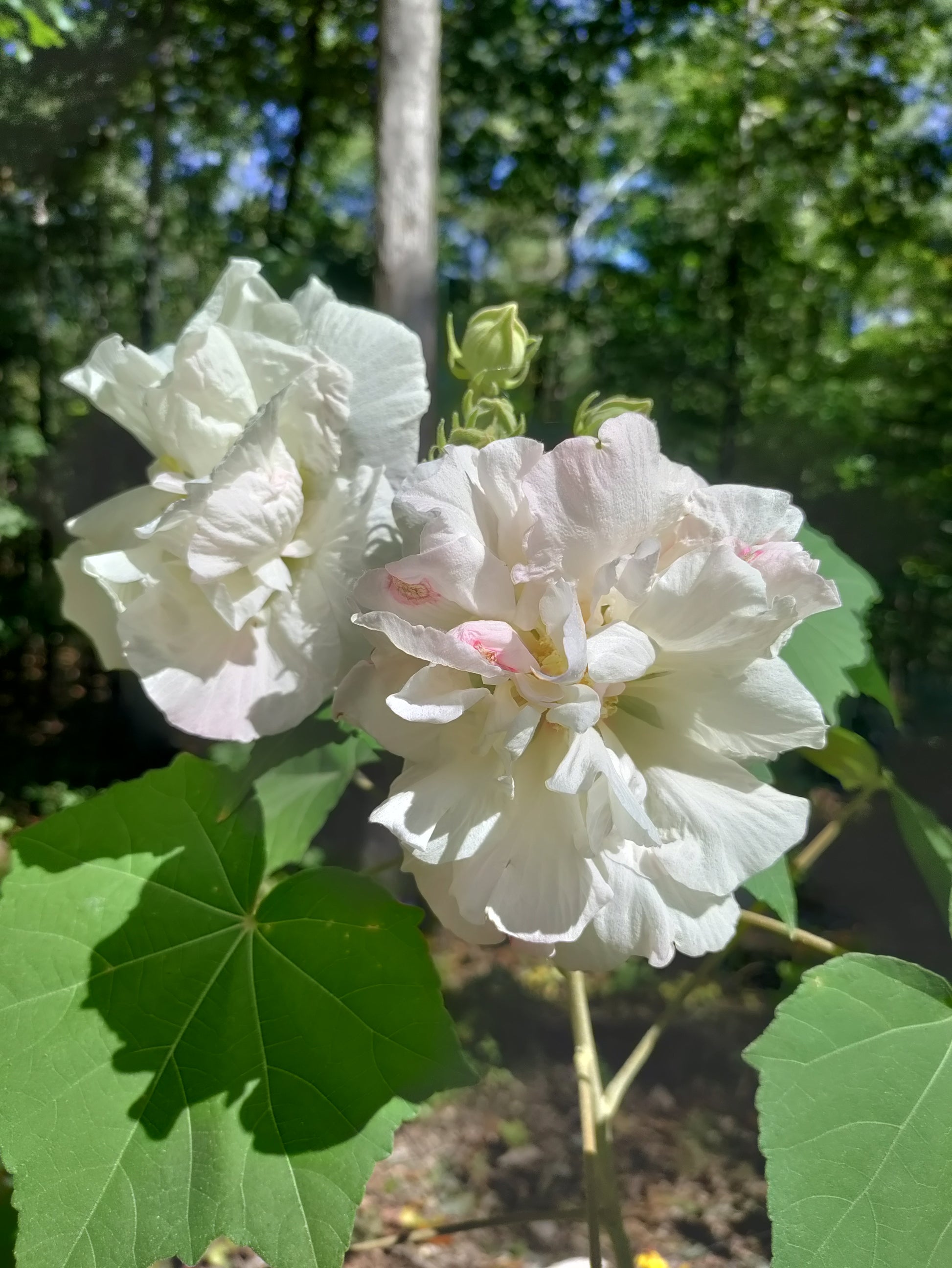 Once well established, this mounding perennial can quickly grow into a large bush 6'-8' tall and wide. During late summer or early fall, it begins heavily blooming large double white flowers, that turn pink as they age. The leaves are maple shaped. Care is typical of other hardy hibiscus: medium watering and partial sun to full sun. In warm climates, the plant may remain all winter. For colder climates, the plant will die back to the ground, but regrows in the spring.