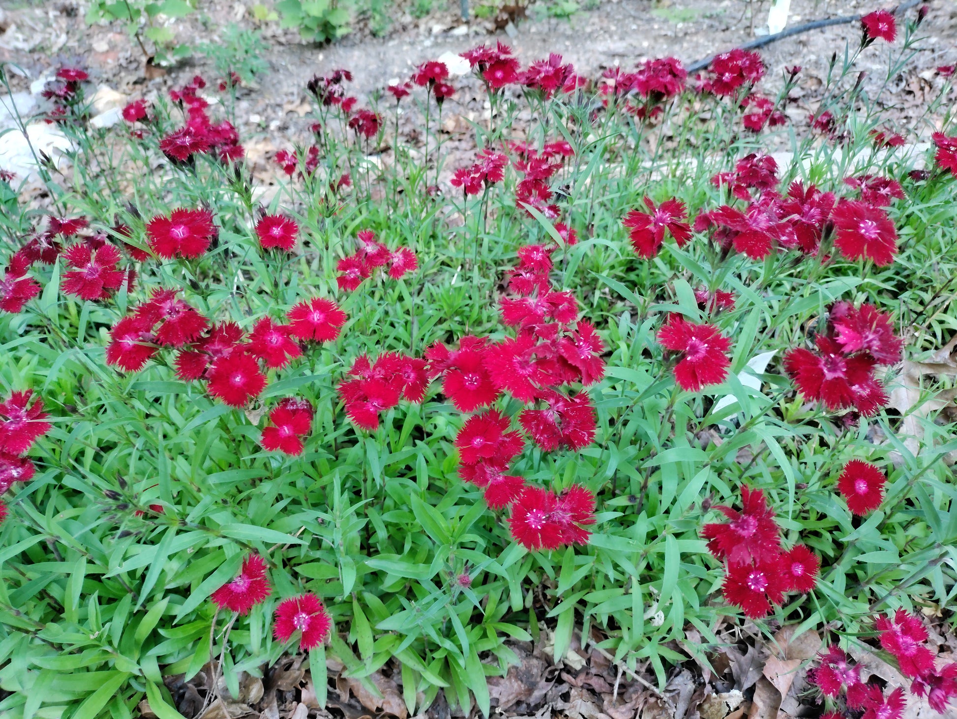 'Rockin Red' dianthus (Dianthus barbatus) sports dark red frilly flowers, that continue all summer long into fall, and doesn't seem to get tired. It can help fill-out a perennial flower bed, a border, or in between two larger plants, as it slowly spreads to fill empty spaces. It also does very well in pots, handling sun, heat, and cold quite nicely.