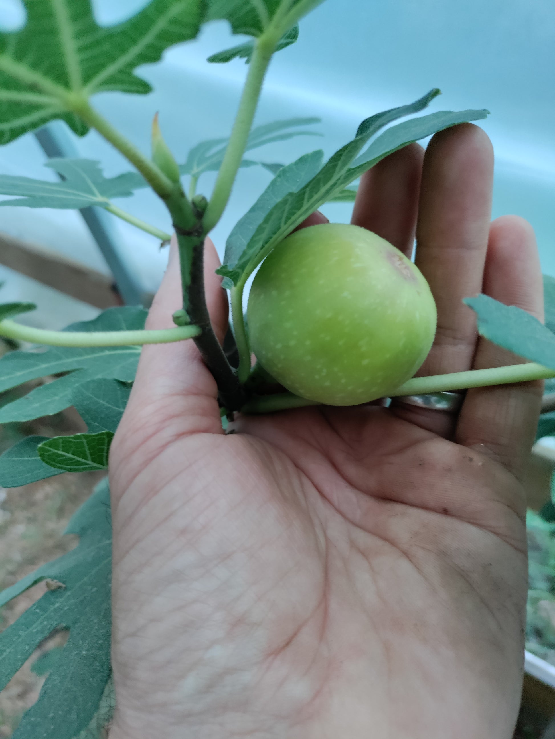 Fig 'Brunswick' makes a large sweet fruit with an open eye. The fruit color is slightly tan when fully ripe, and the leaves are attractive, being large and quite serrated. For me, it sets two rounds of fruit per year, with one being early summer and the other being late summer or early fall.