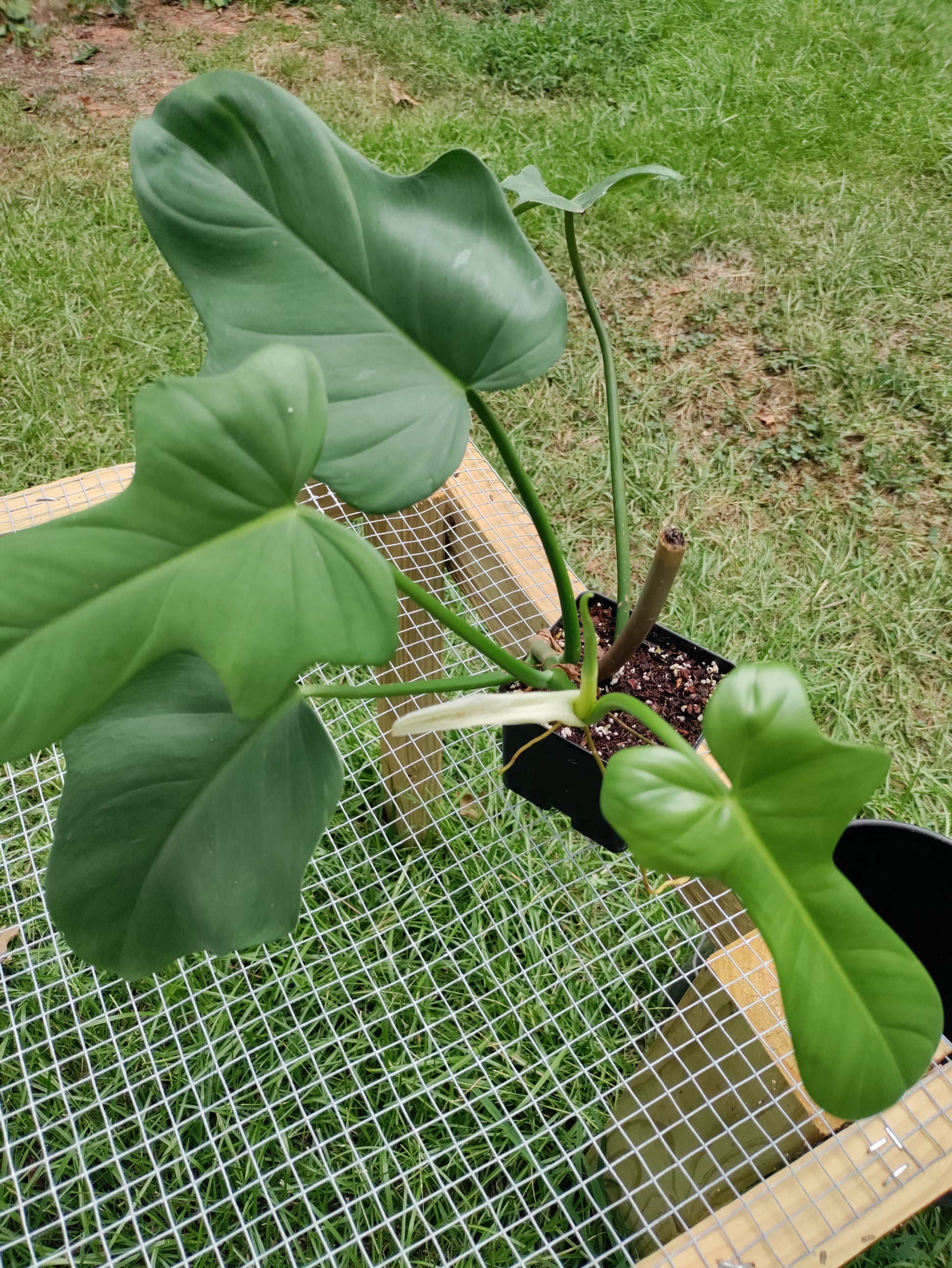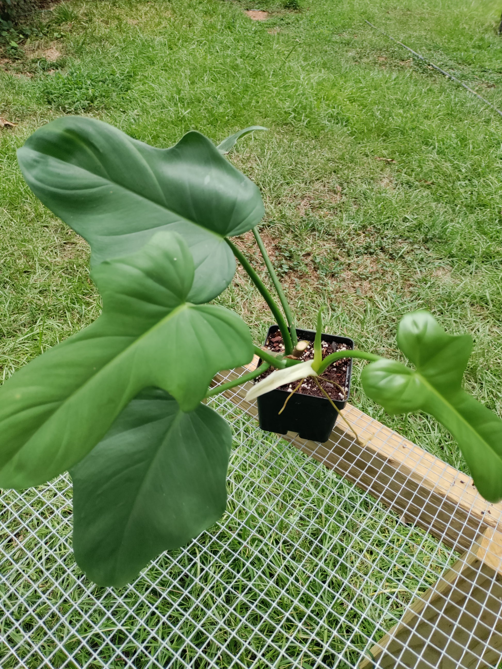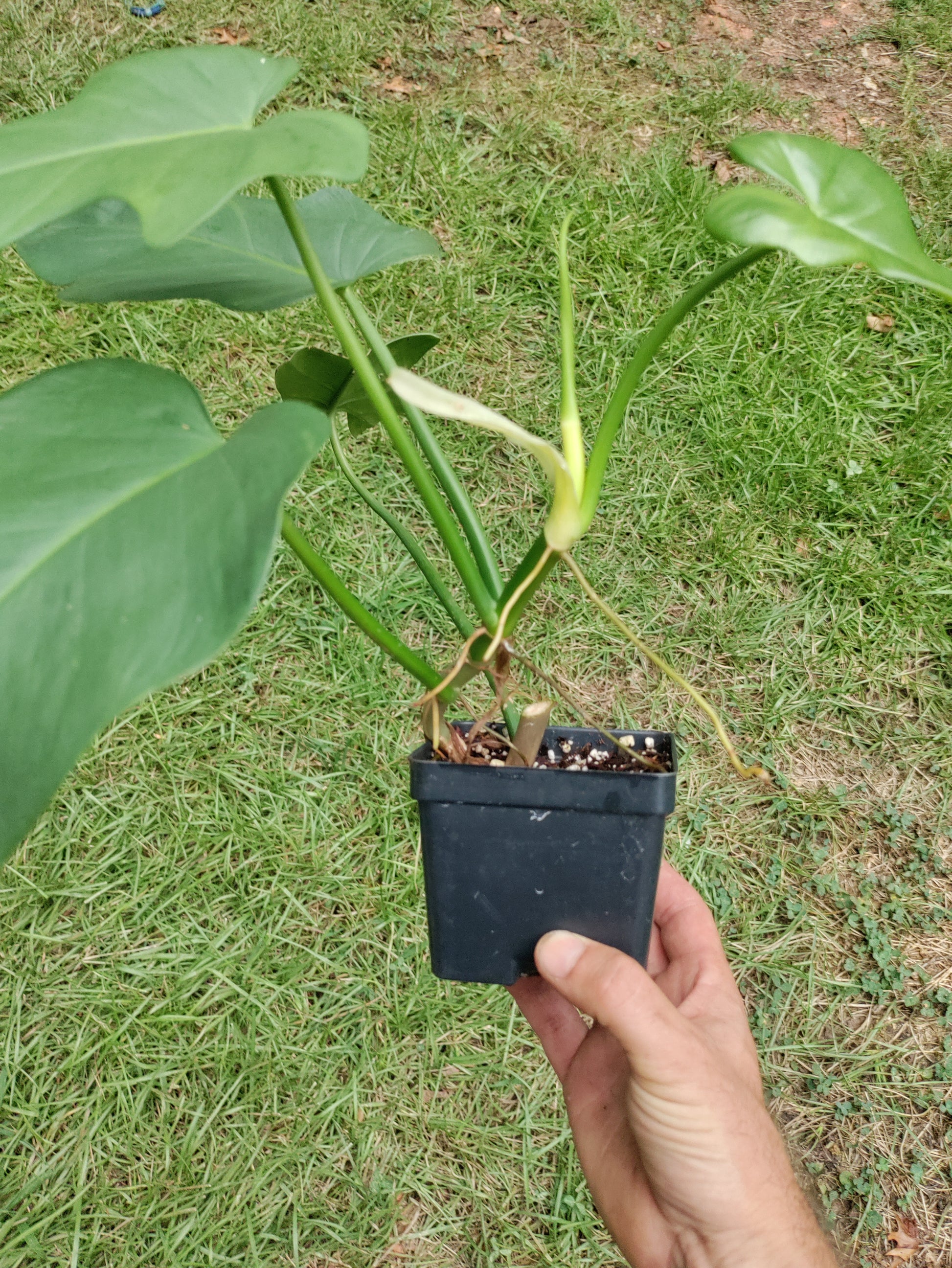 Philodendron bipennifolium, or Horsehead Philodendron, can make a dramatic addition in any room. That is, if you're looking for that "I've got a plant that belongs in a jungle" kind of effect. Fast growing vines with large (12") leaves and aerial roots, this philo can sprawl and scramble up whatever is near the pot if you let it go. Care is pretty typical for a philodendron. Water when the top of the soil is dry, and low to moderate indoor sunlight is what it prefers. When the weather is warm, don't be afraid to put it outside in the shade.