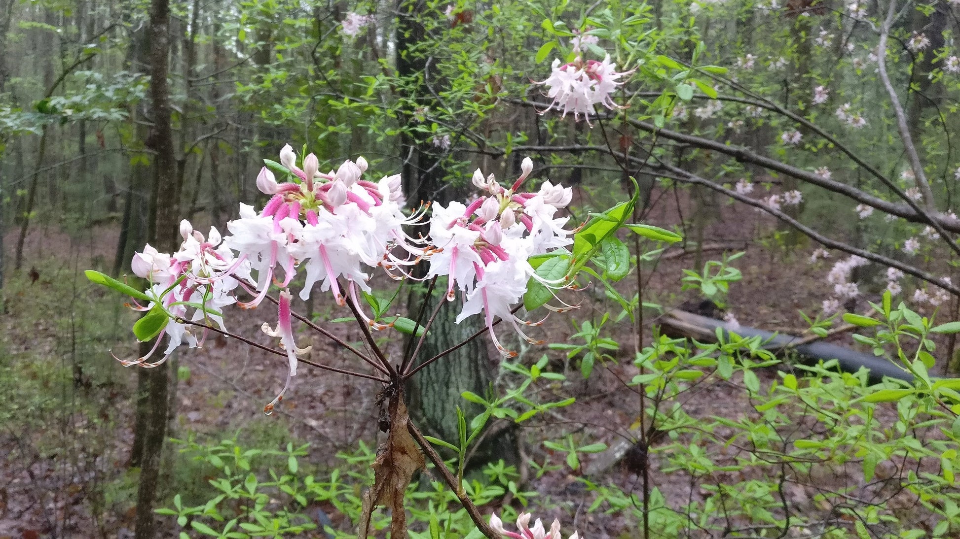A deciduous native azalea, Piedmont or Mountain Azalea puts on a real show in early spring with it's pink and white flowers that bloom in bunches before the leaves appear. This specimen was collected from a shaded bank along a creek, and this tells you this plant prefers constant moisture, but with a well drained soil. It can get quite tall if allowed, but would be easy to maintain the size with trimming. Deer do browse this plant, but for pets and people, like Japanese azalea, it is poisonous.