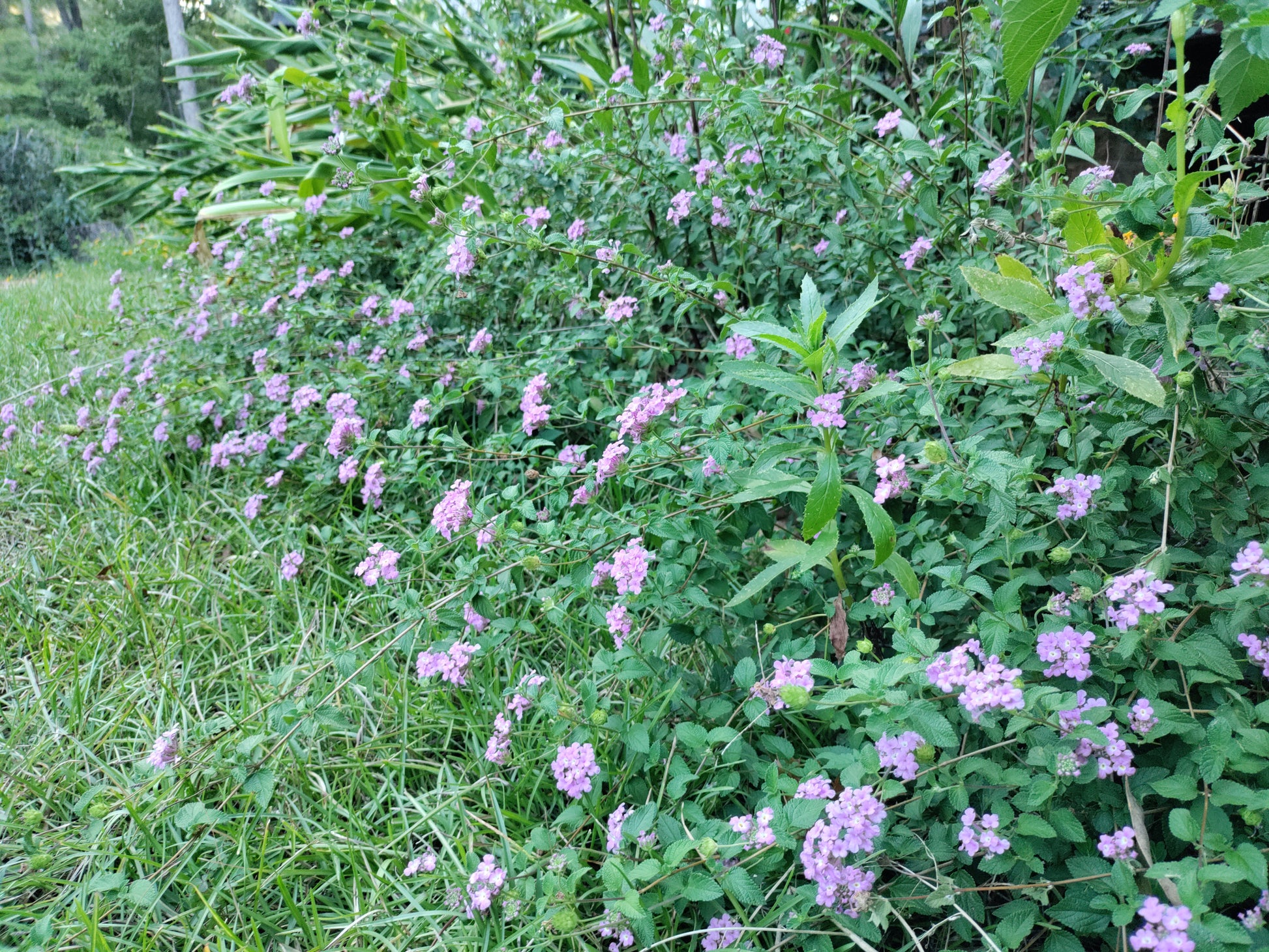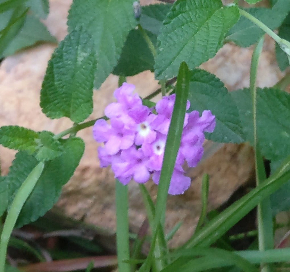 This purple trailing lantana (Lantana montevidensis) will form a 3 ft x 3 ft mound that blooms purple clusters of small flowers from spring until frost. Very drought tolerant once established, it also makes a good potted plant. In at least zone 8 and warmer, this plant returns year after year, and may survive in colder zones with mulch.
