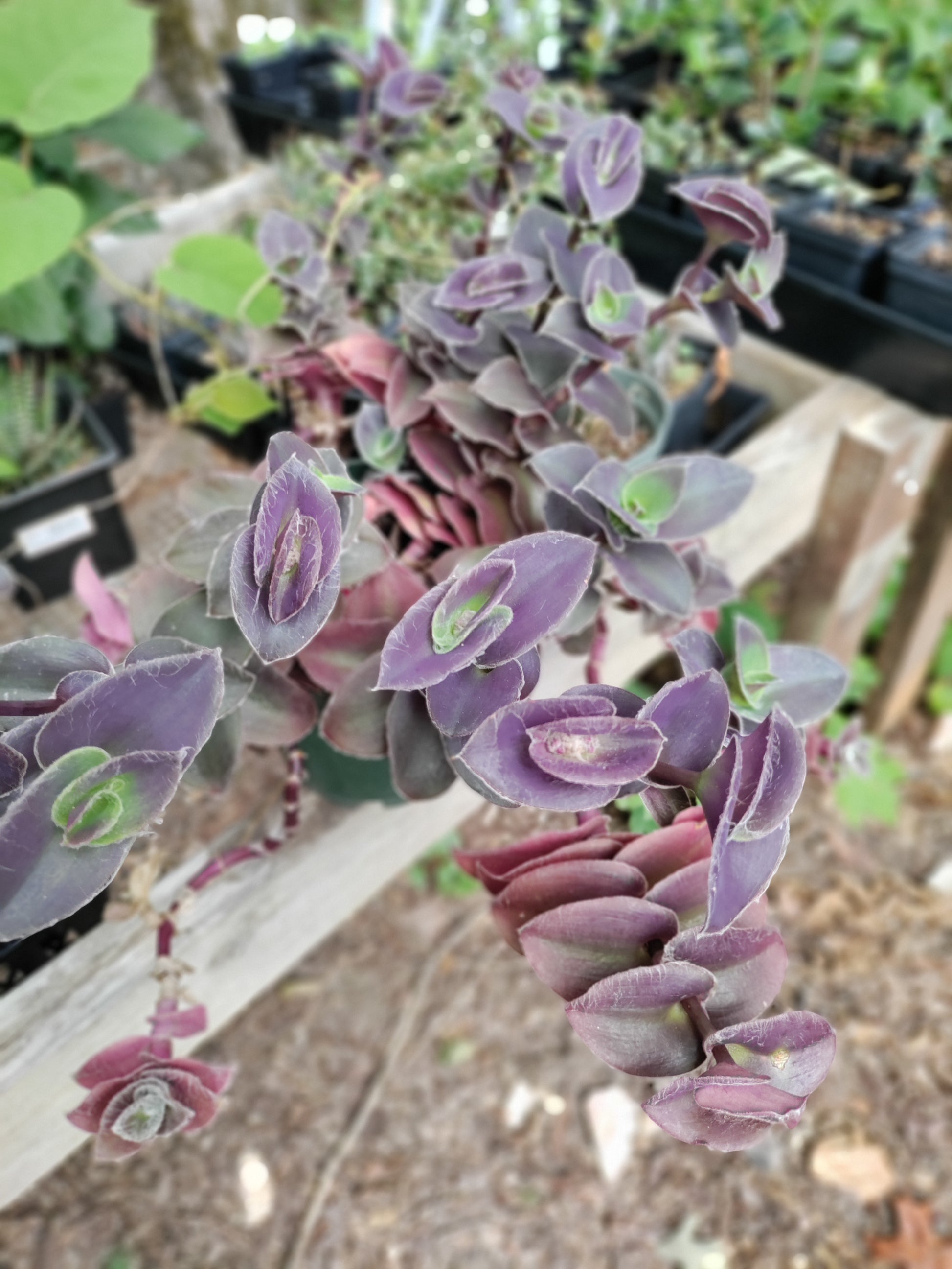 Tradescantia 'Pale Puma' is a fuzzy purple succulent that is perfect for trailing over the sides of a pot, wall, or used as a groundcover. Cold hardy in the ground down to zone 7b, this plant is my favorite variety of Wandering Jew because I can just leave it alone and it won't die. Like others of this type, it prefers medium to low light and needs water only when the top of the soil is dry. Pests are few, but slugs and snails may eat the leaves if left unchecked. It also makes a very nice houseplant. Also called: Tradescantia 'Purple Fuzzy'